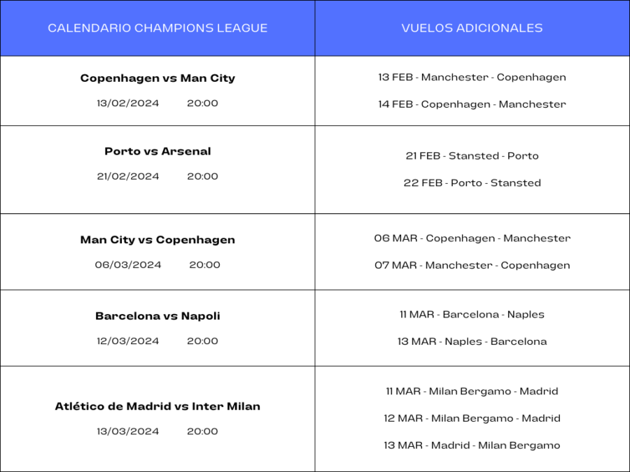 Ryanair, añadió, desde el 22 de diciembre, más de 4.000 asientos extra para facilitar que los aficionados al fútbol viajen a apoyar a su equipo favorito en las próximas rondas eliminatorias de la Champions League en febrero y marzo.