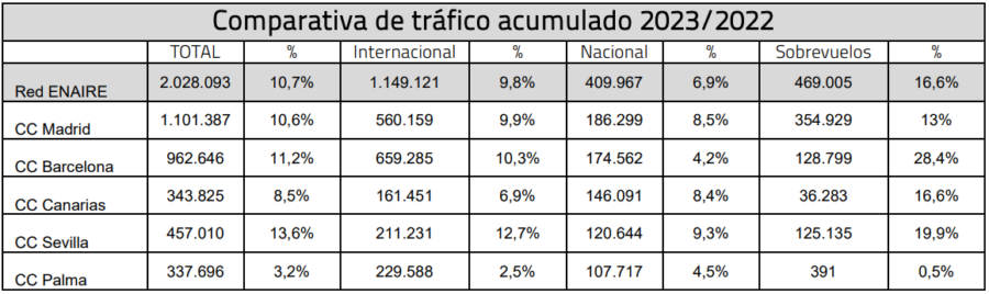 En los once primeros meses del año, los gestionados por ENAIRE fueron más de 2 millones de vuelos (2.028.093), casi el 11% más que en el mismo periodo de 2022 (10,7%). Los sobrevuelos de enero a noviembre (469.005) aumentaron el 16,6%; los internacionales (1.149.121), el 9, 8% y, los nacionales (409.967), el 6,9%. Por centros de control, destacan en los datos acumulados los de Sevilla, con 457.010 vuelos gestionados, el 13,6% más; Barcelona, con 962.646, el 11, 2% más, y Madrid, con más de un millón de vuelos (1.101.387), el 10,6% más. La comparativa del acumulado de 2023 con el mismo periodo de 2019 supone un aumento del 1,4%.