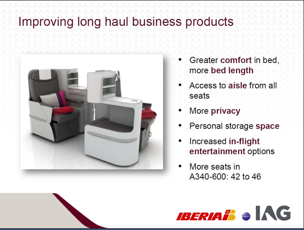 También se mostró una diapositiva de la que podría ser la anunciada nueva Clase Business de Iberia, con asientos escalonados que dan acceso directo a todos los pasajeros al pasillo. También otra con los posibles nuevos asientos de clase turista, similares, eso sí , a los actuales.
