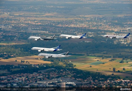 Airbus ha realizado un nuevo acto promocional del A350 XWB coincidiendo con la certificación del modelo por EASA. Finalizados los vuelos de certificación del A350 XWB, Airbus ha realizado un vuelo en formación sobre Toulouse con los cinco aviones que han participado en dicho programa de ensayos en vuelo.