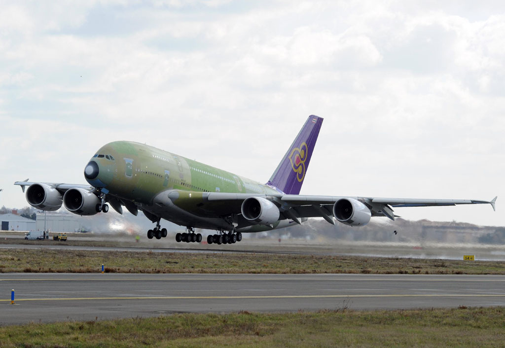 El primer Airbus A380 de Thai ha completado su primer vuelo desde el aeropuerto de Toulouse.