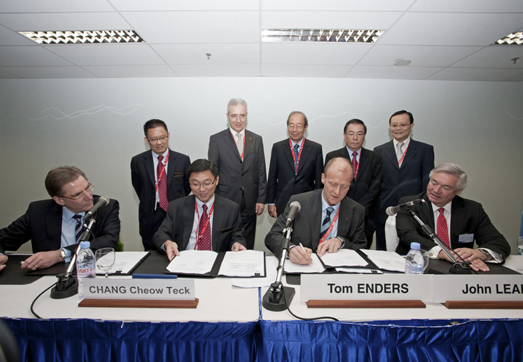 Chang Cheow Teck, presidente de ST Aerospace; Tom Enders, presidente y consejero delegado de Airbus; y Andreas Sperl, consejero delegado de EADS EFW han firmado en Singapur un acuerdo de intenciones para “el desarrollo del programa de conversión A330 de pasaje a carguero (P2F)” y que además “establece las bases del proyecto y la concesión de la ‘autorización para ofertar’ para el A330P2F.