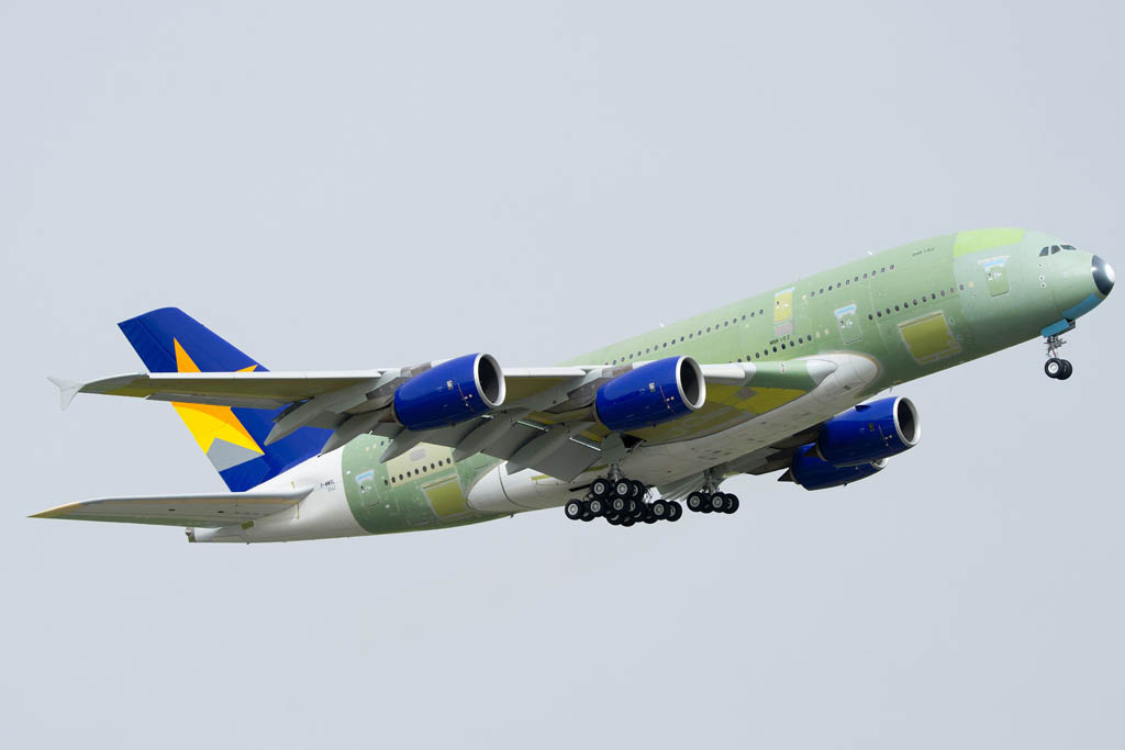 El primero de los seis Airbus A380 (número de serie 162) adquiridos por la aerolínea japonesa Skymark ha realizado su primer vuelo y pronto será trasladado a Hamburgo para su pintado y equipamiento interior,