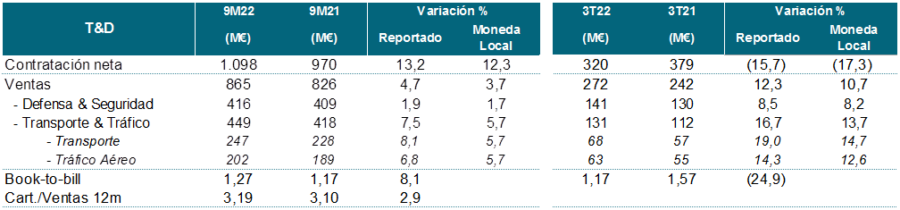 Durante el tercer trimestre del año se mantuvo el crecimiento de dos dígitos. Los ingresos de la división de Transporte y Defensa en el periodo ascendieron a 272 millones de euros, un 11 por ciento más que en 2021, 11% en moneda local, impulsados asimismo por Transporte & Tráfico (+14% en moneda local), con crecimientos de doble dígito tanto en el segmento de Transportes (+15%, por la mayor actividad en América y AMEA) como de Tráfico Aéreo (+13%, gracias a la recuperación generalizada del tráfico aéreo en todas las geografías). De igual forma, Defensa & Seguridad presentó un sólido crecimiento del +8%, principalmente por la mayor actividad puntual del proyecto Eurofighter en el tercer trimestre.