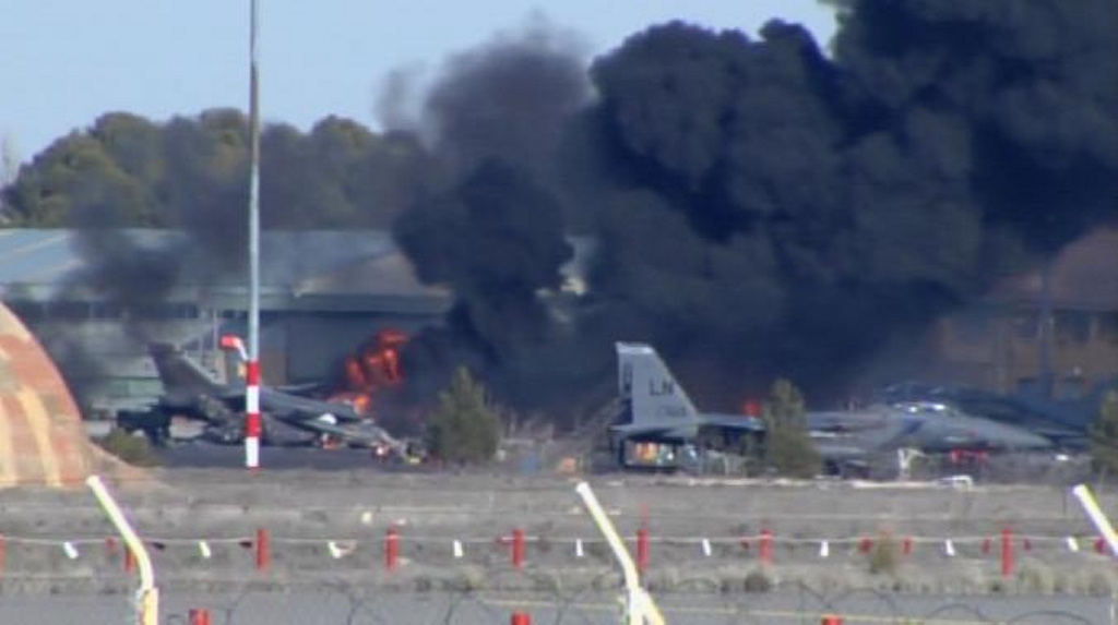 Incendio en la plataforma de Albacete tras el impacto del F-16 griego. Incendio en la plataforma de Albacete tras el impacto del F-16 griego.